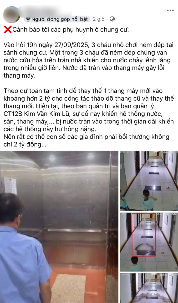 19:00, 27/09/2025: Một đoạn clip lan truyền trên mạng xã hội ghi lại khoảnh khắc 3 bé trai ném dép ở hành lang tầng 5. Một chiếc dép vô tình trúng đầu phun PCCC (sprinkler), khiến nước phun ào ạt như cơn lũ nhỏ. Nước nhanh chóng tràn vào hố thang (PIT), làm 2 thang máy “điêu đứng” và phải dừng khẩn cấp.